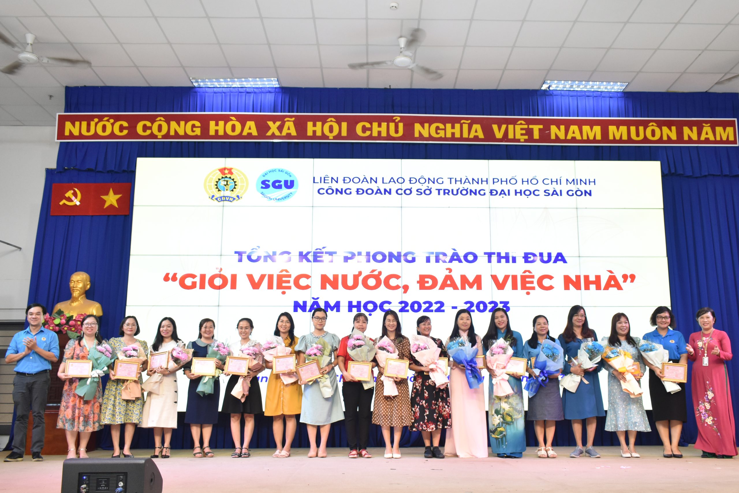 Tại buỗi lễ, Công đoàn Trường tổ chức tổng kết, tuyên dương, khen thưởng cho 37 nữ viên chức, người lao động đạt danh hiệu “Giỏi việc nước, đảm việc nhà” tiêu biểu năm học 2022-2023.